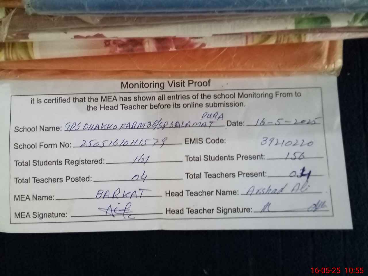 | EMIS Code: 39210220 | Name of School: GPS DHAKKO FARM CHAK NO. 36/SP SALAMAT PURA | |||
