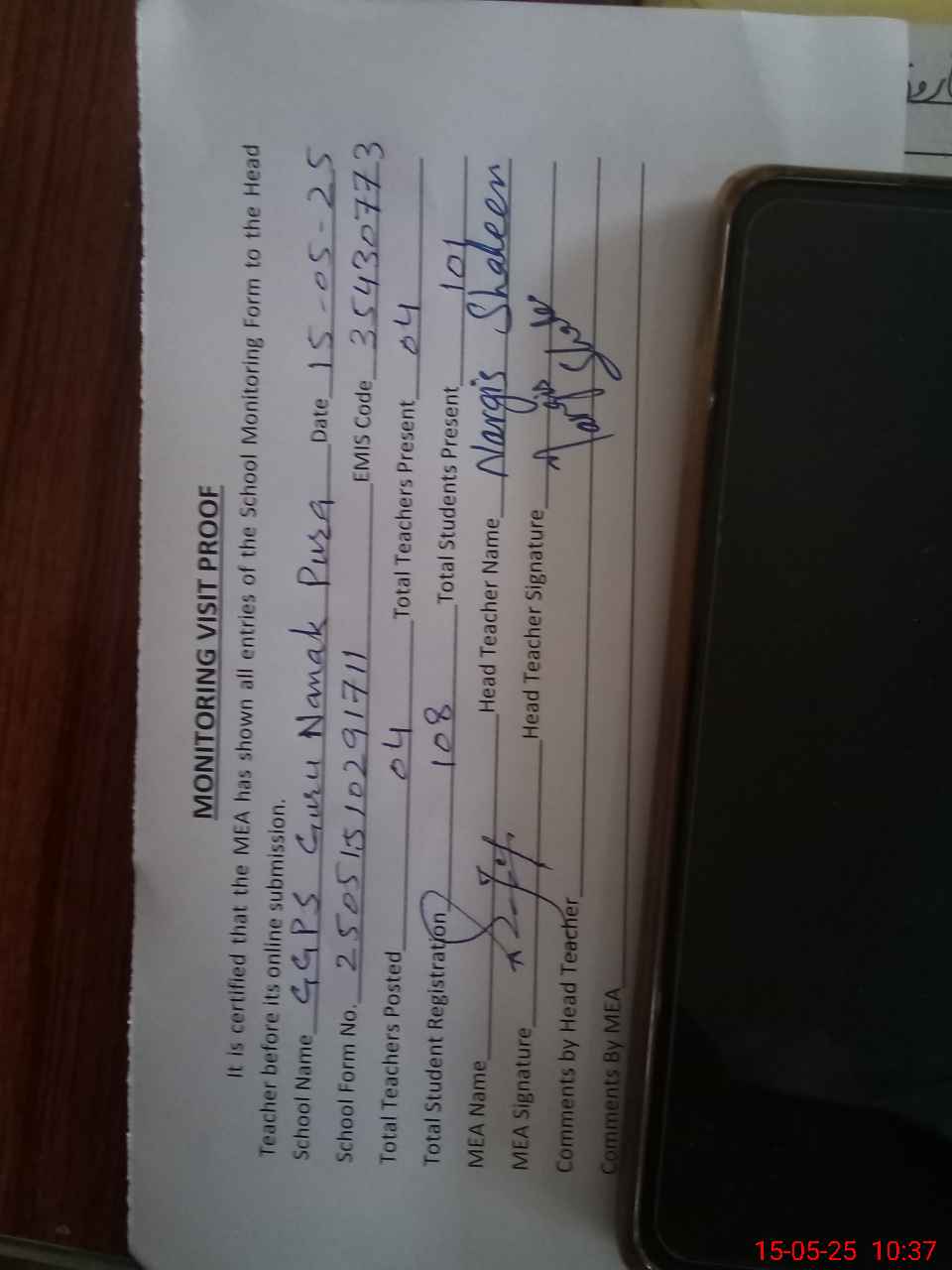 | Attendance Register | Head Teacher | MEA with School | Visit Proof |