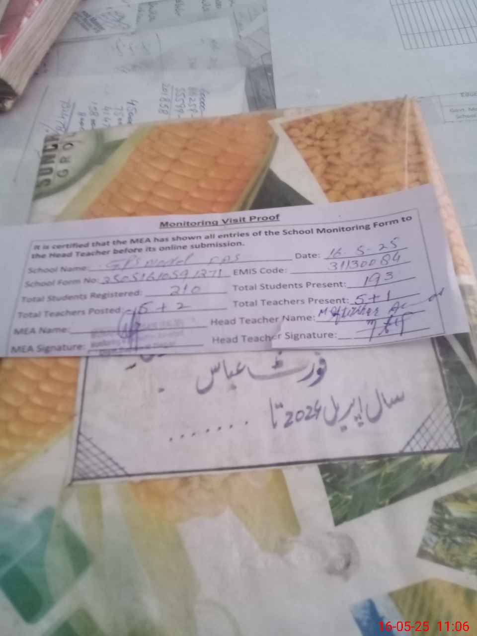 | Attendance Register | Head Teacher | MEA with School | Visit Proof |