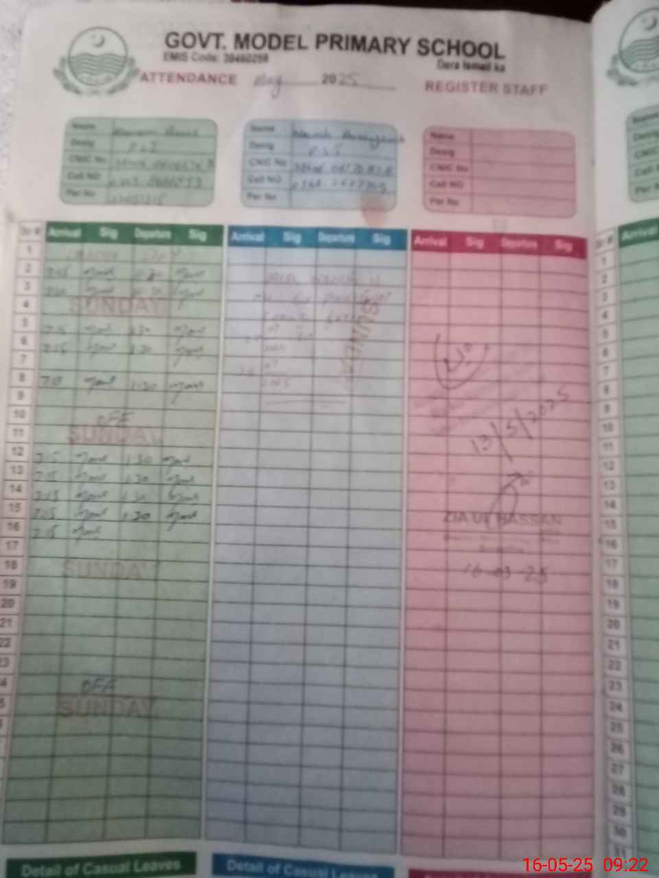 | CNIC | Full Name | Designation | R/C | Absence during last cal. month |