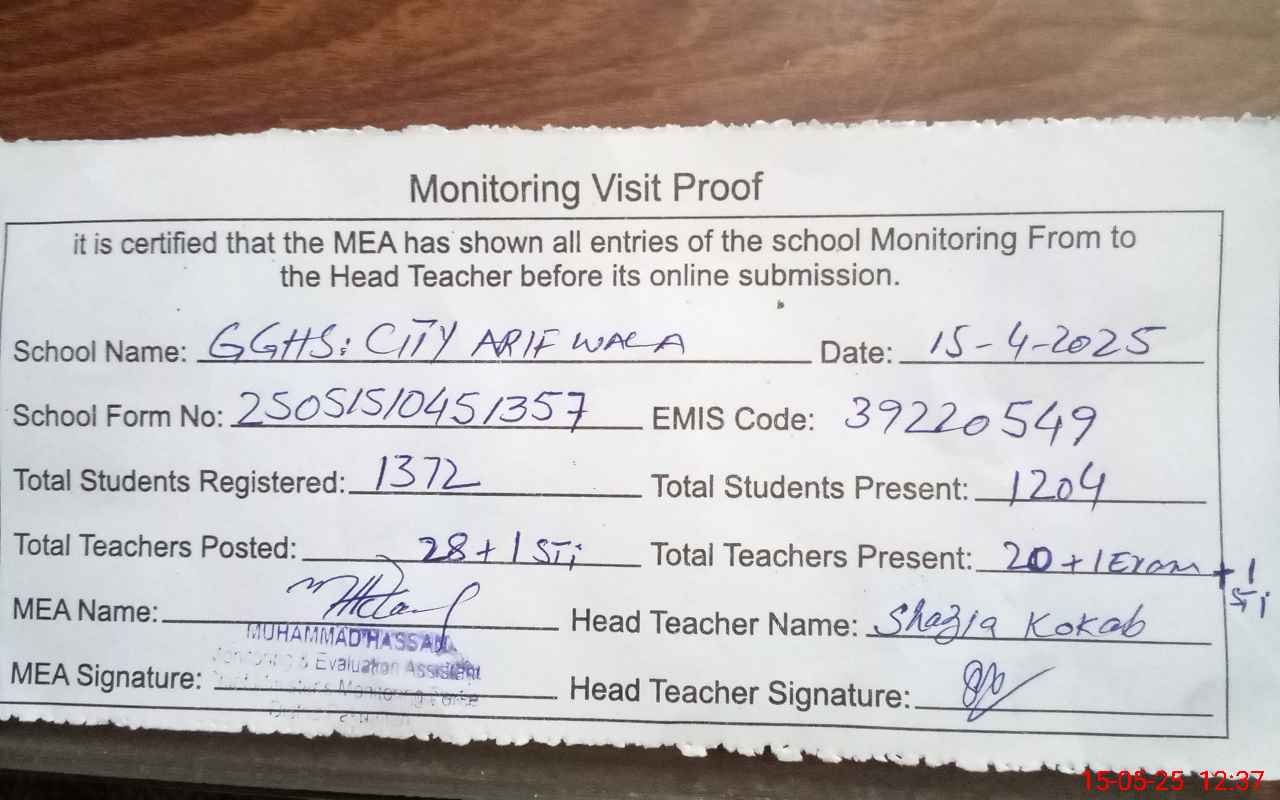 | EMIS Code: 39220549 | Name of School: GGHS CITY ARIFWALA | |||