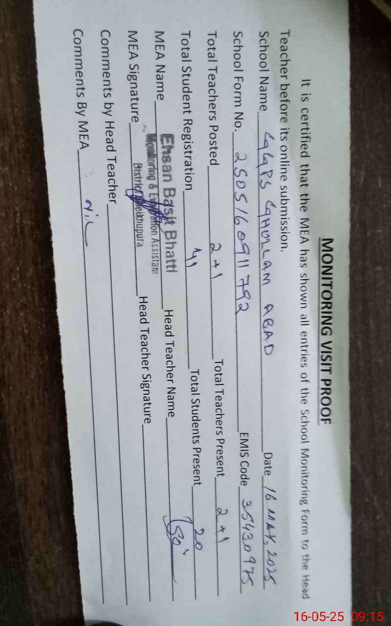 | EMIS Code: 35430975 | Name of School: GGPS GHULAM ABAD | |||