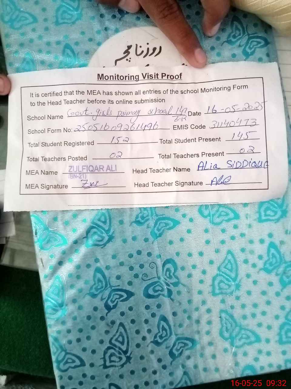 | Attendance Register | Head Teacher | MEA with School | Visit Proof |