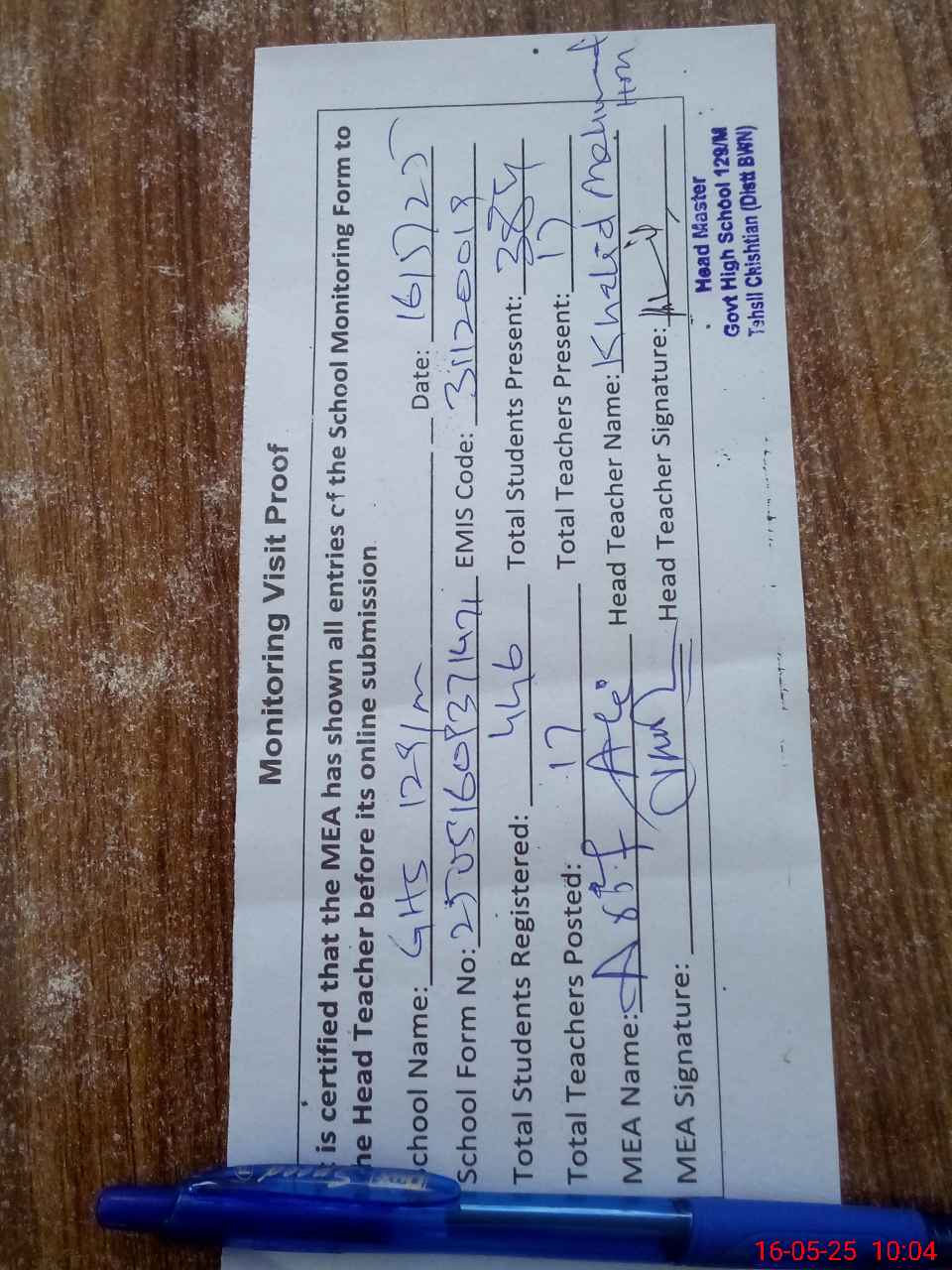 | EMIS Code: 31120019 | Name of School: GHS CHAK NO. 129/M | |||