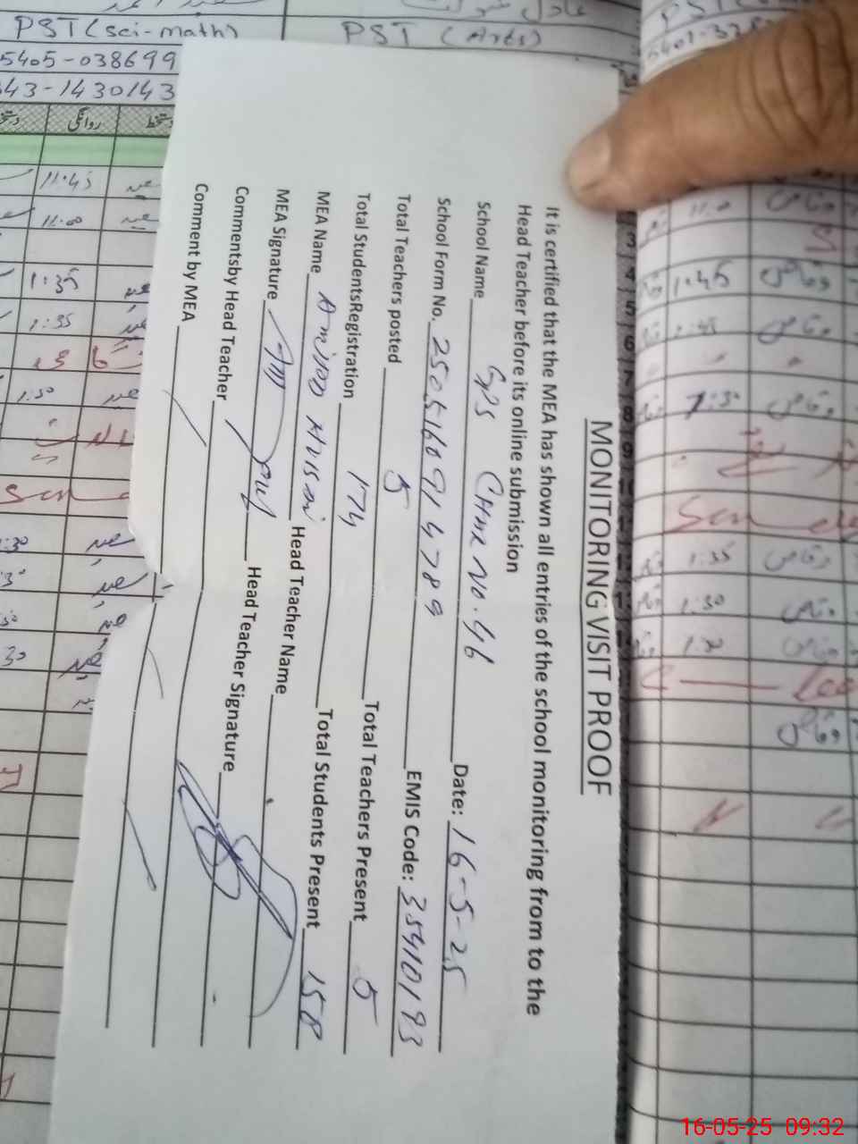| Name: SH**** HU**** Designation: (School Headmaster's/Headmistress's) PST Phone/Cell Number: 03**** |
