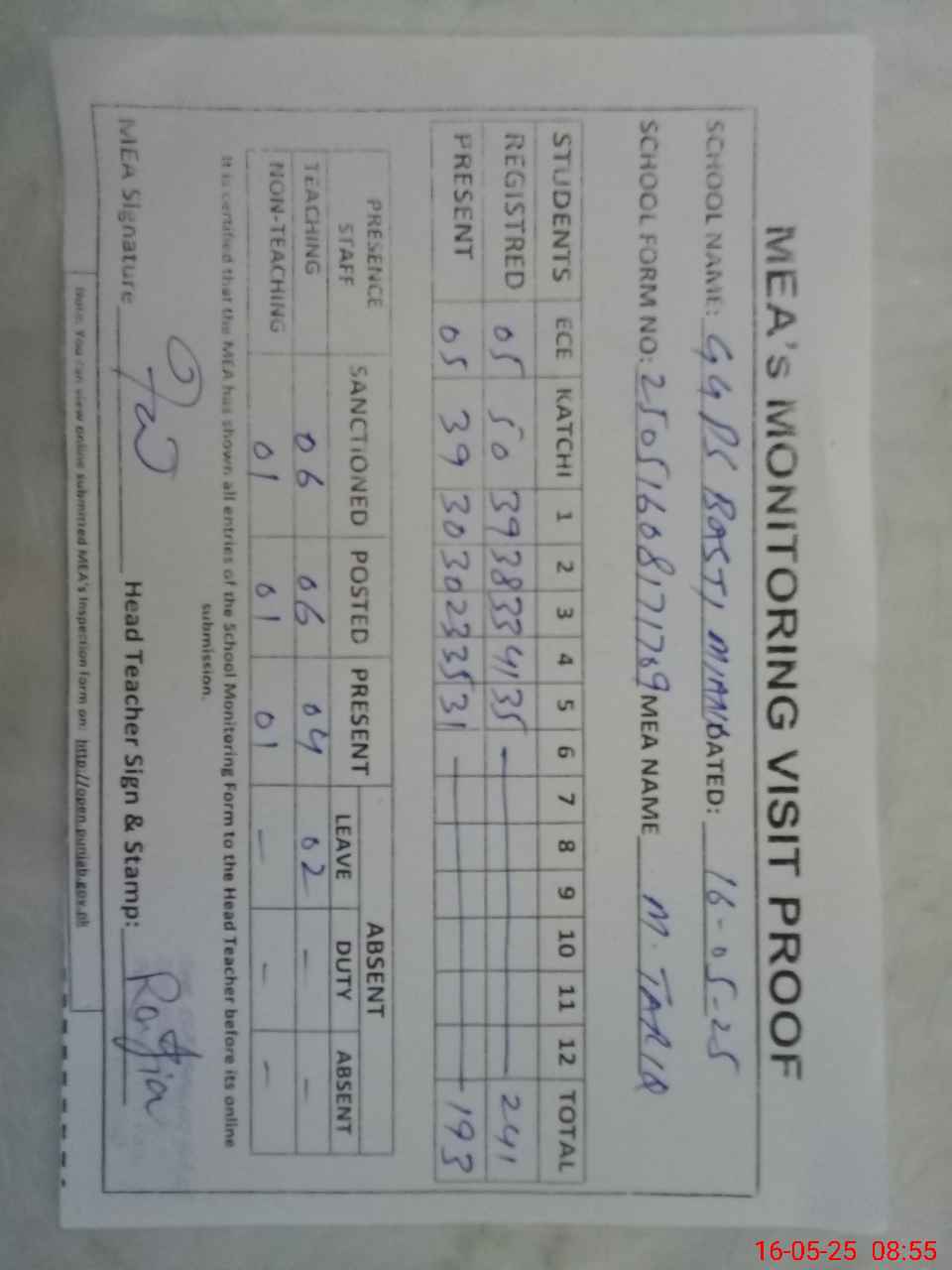 | Attendance Register | Head Teacher | MEA with School | Visit Proof |
