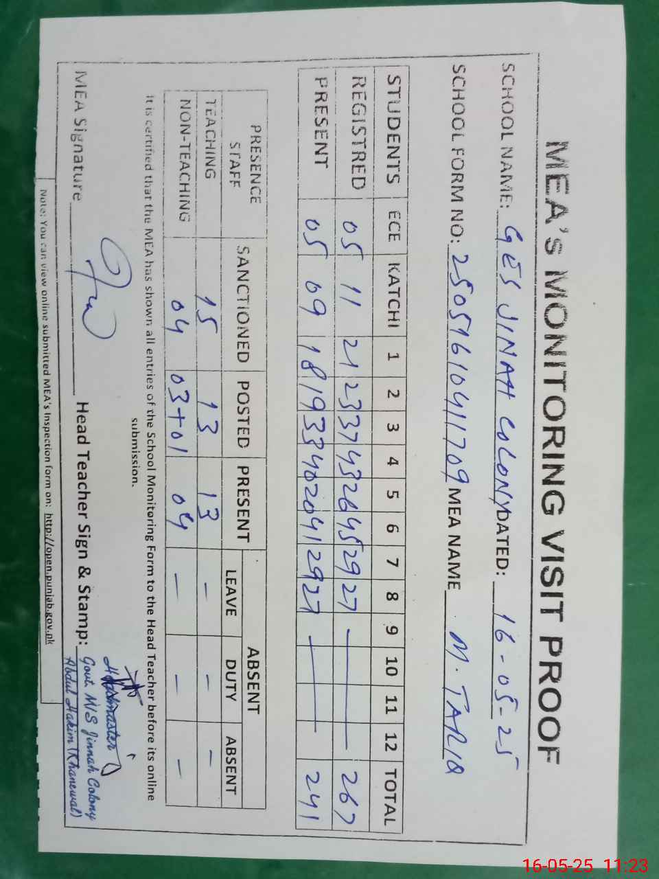 | Attendance Register | Head Teacher | MEA with School | Visit Proof |