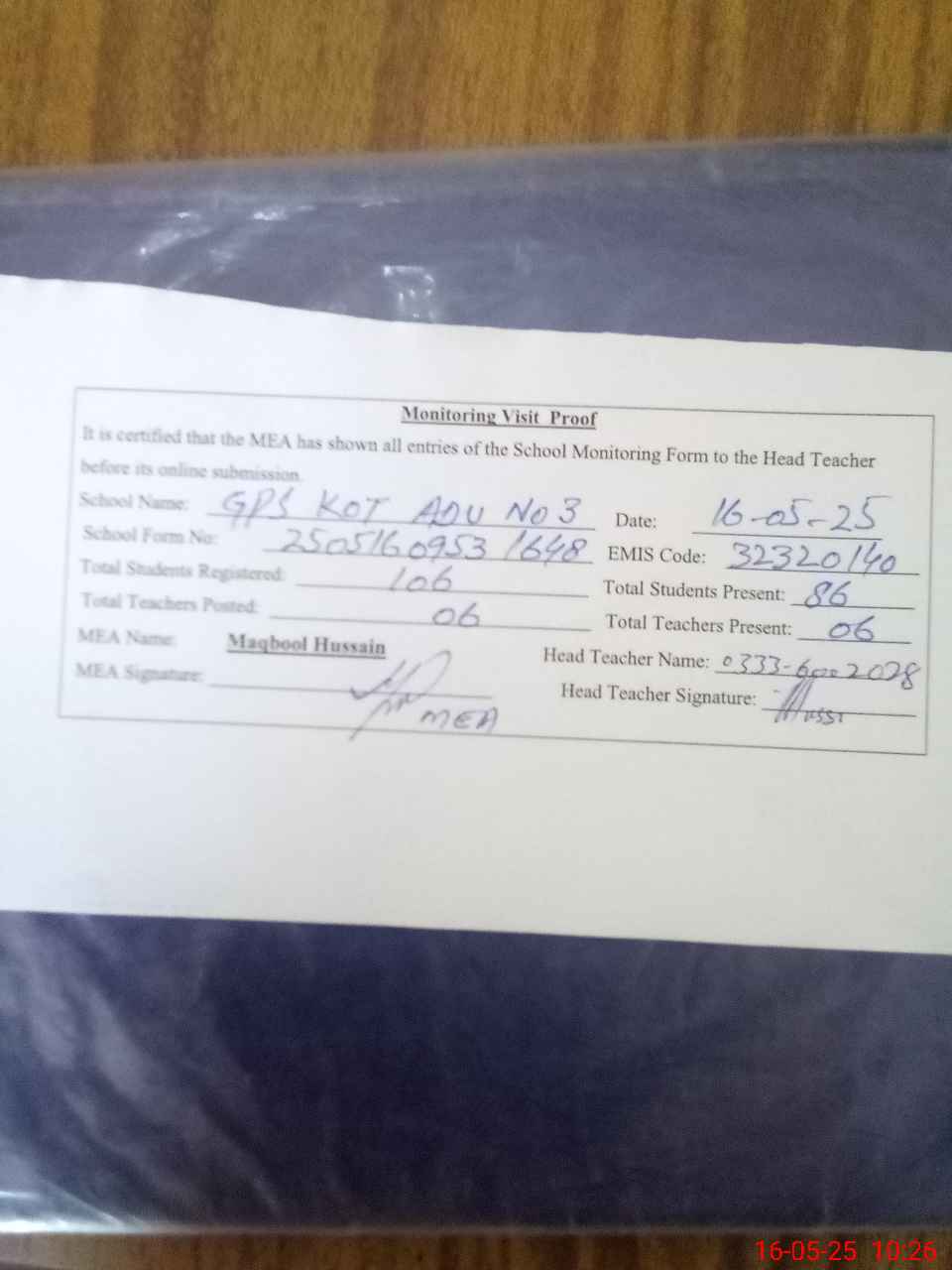 | EMIS Code: 32320140 | Name of School: GPS KOT ADU NO. 3 | |||