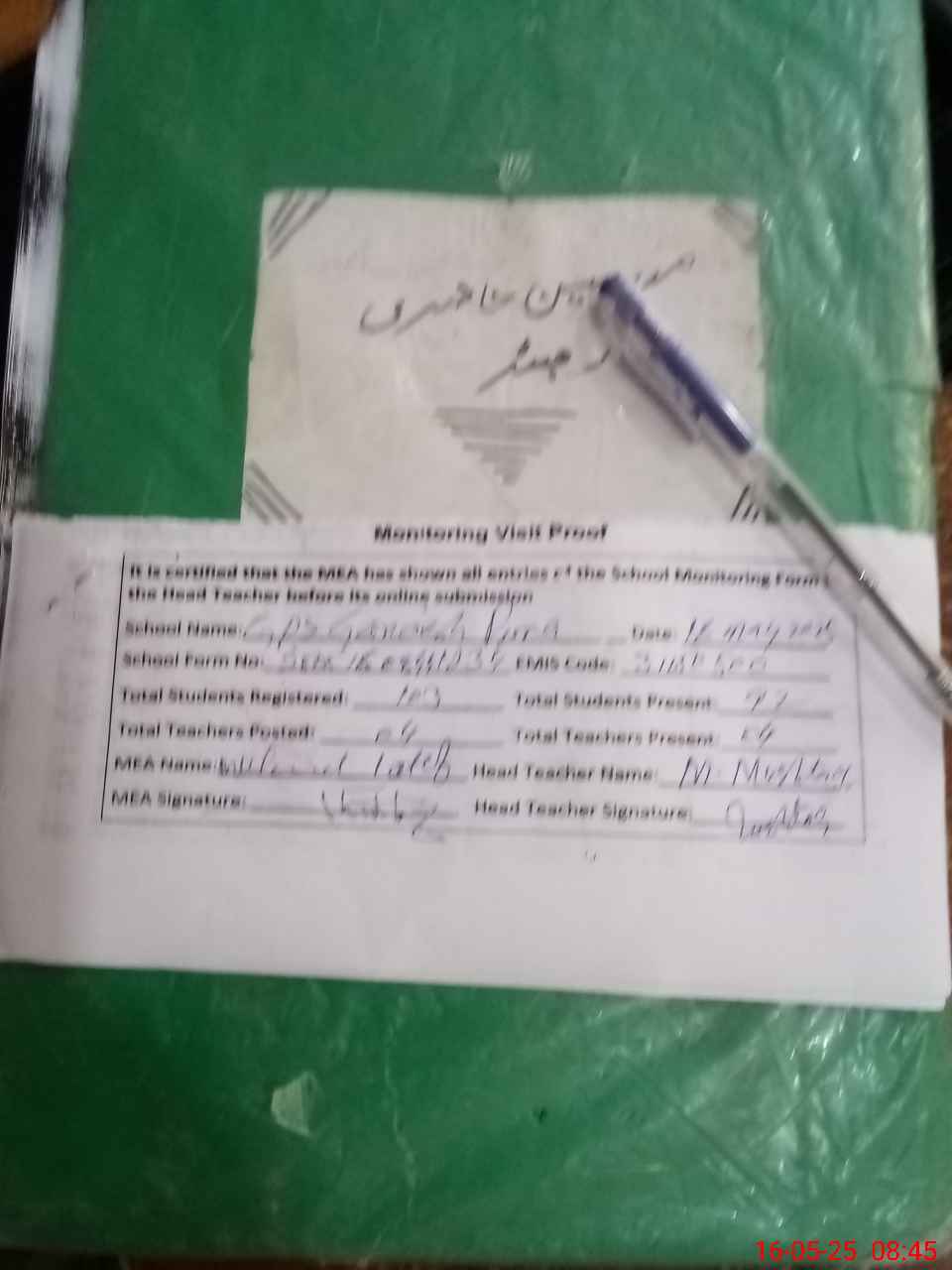 | Attendance Register | Head Teacher | MEA with School | Visit Proof |