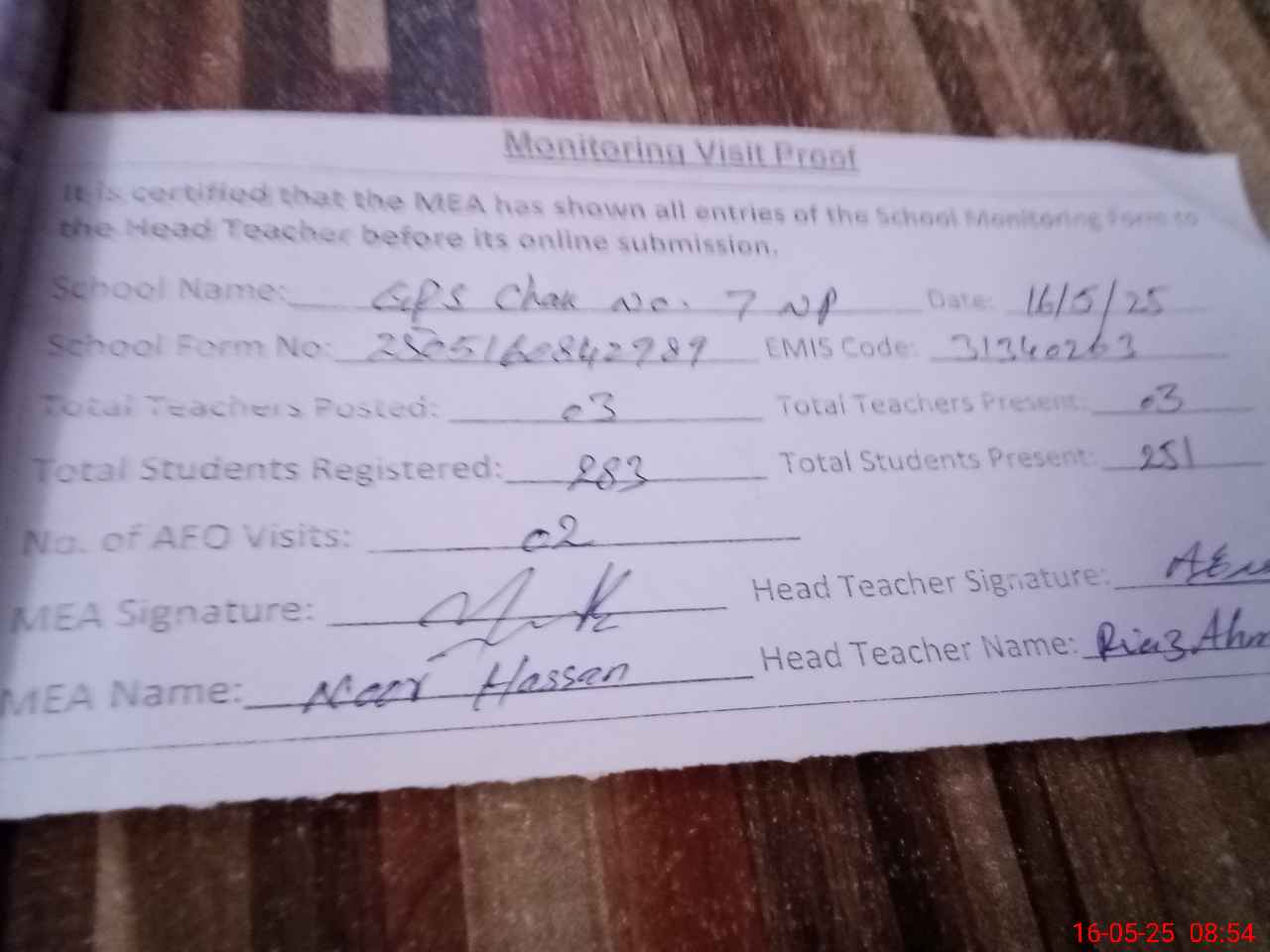 | Attendance Register | Head Teacher | MEA with School | Visit Proof |