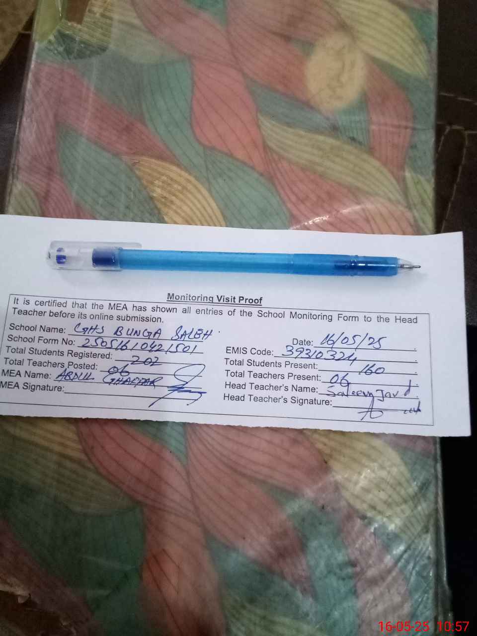 | Attendance Register | Head Teacher | MEA with School | Visit Proof |