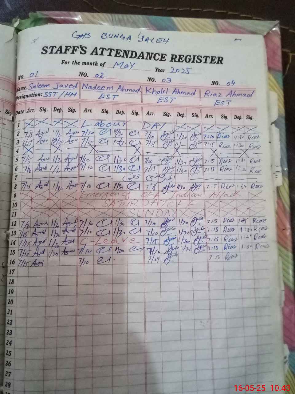 | CNIC | Full Name | Designation | R/C | Absence During Last Calender Month |