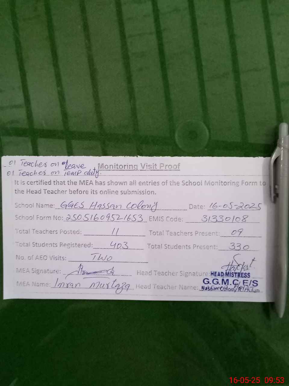 | Attendance Register | Head Teacher | MEA with School | Visit Proof |