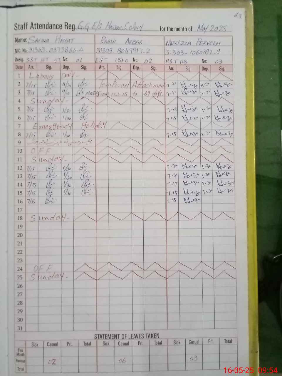 | CNIC | Full Name | Designation | R/C | Absence During Last Calender Month |
