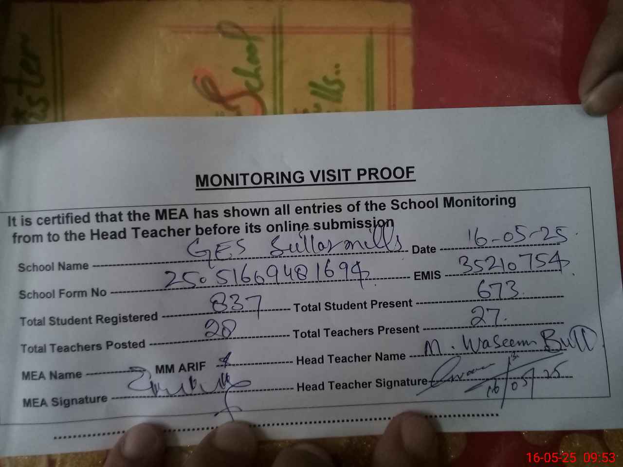 | Attendance Register | Head Teacher | MEA with School | Visit Proof |