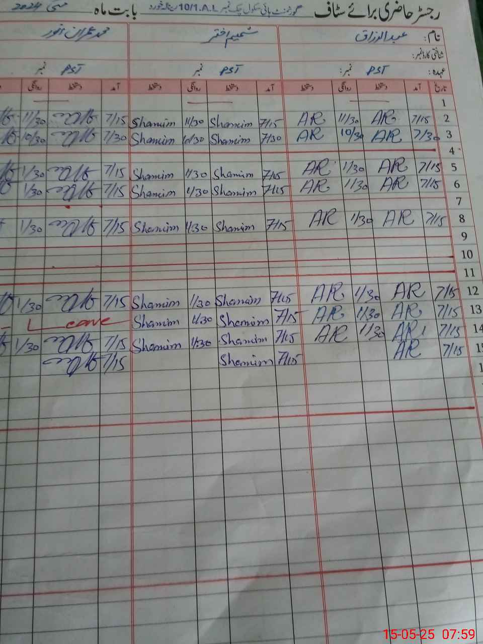 | CNIC | Full Name | Designation | R/C | Absence During Last Calender Month |