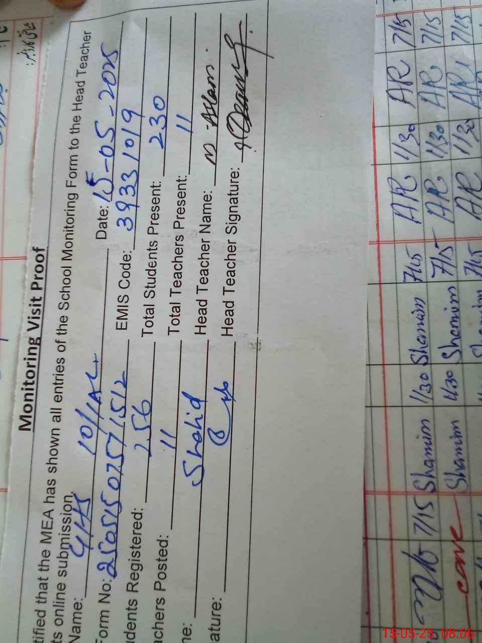 | Attendance Register | Head Teacher | MEA with School | Visit Proof |