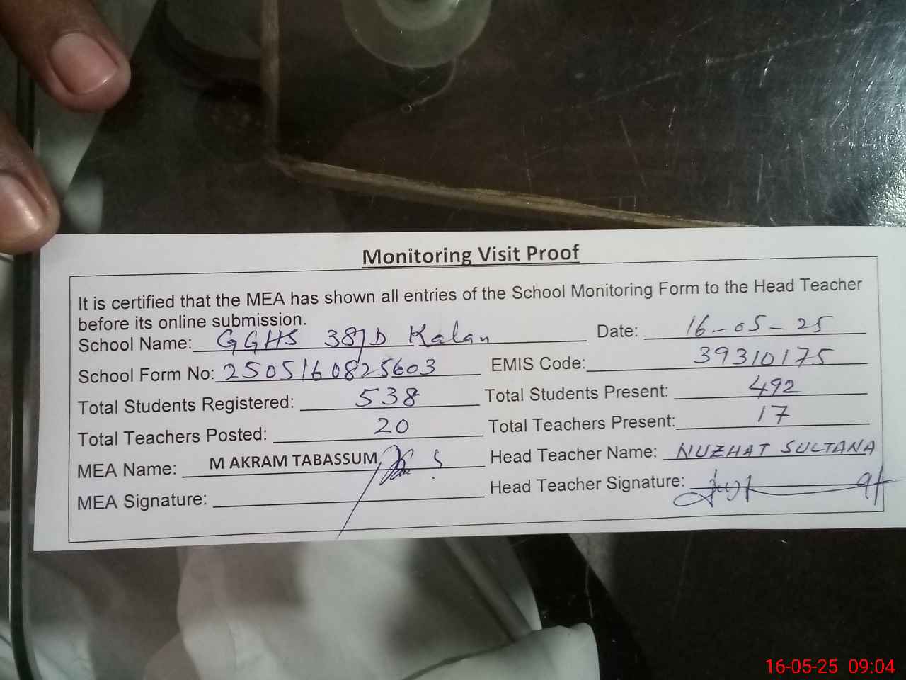 | Attendance Register | Head Teacher | MEA with School | Visit Proof |