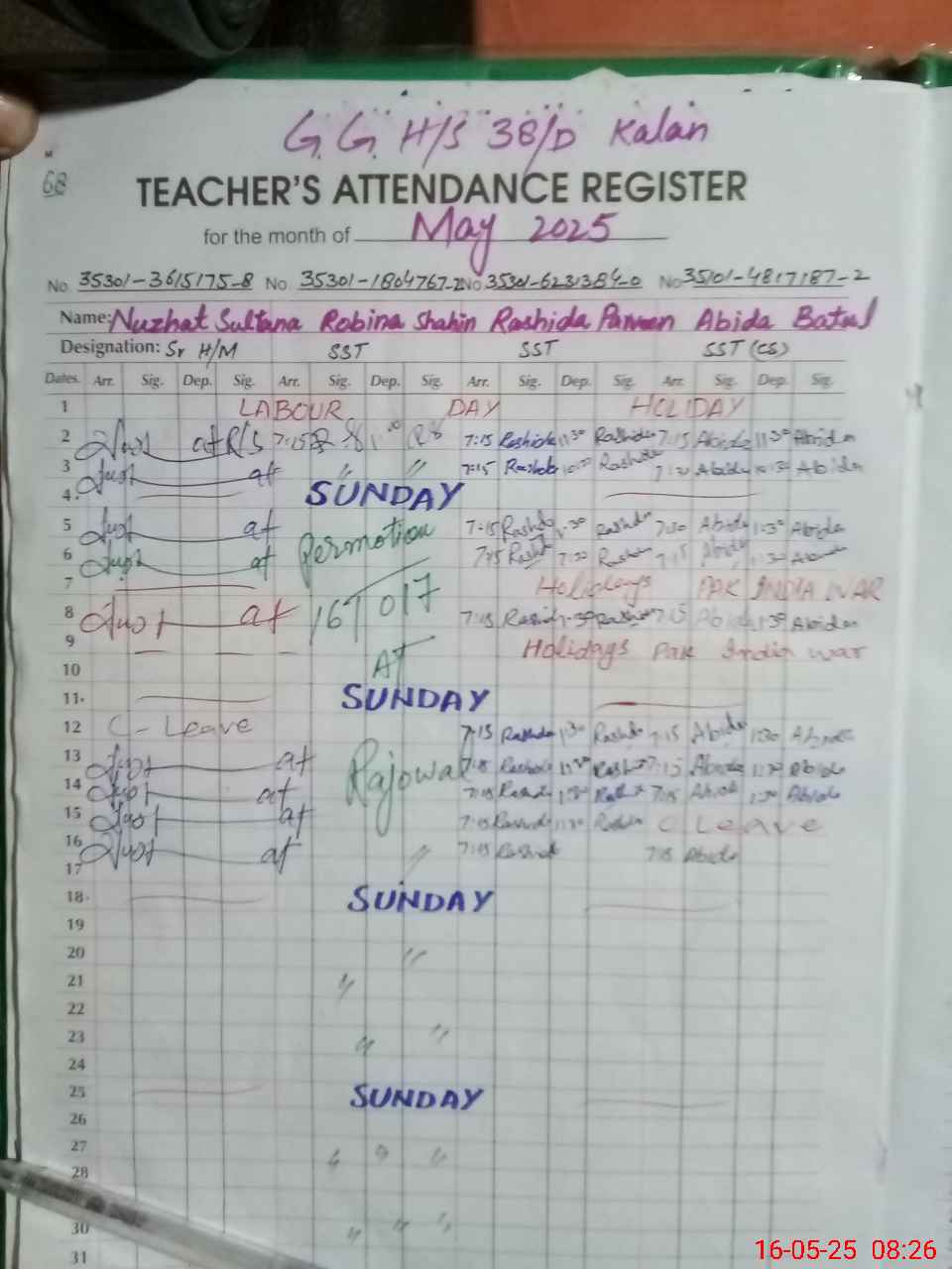 | CNIC | Full Name | Designation | R/C | Absence During Last Calender Month |