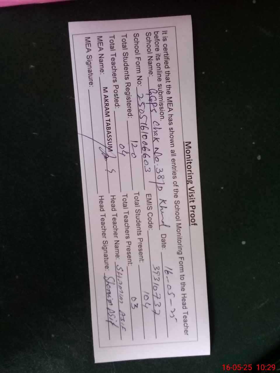 | Certified that this School was Inspected by the Undersigned MEA/DMO Today and the Information Stated Above is as Per Record. | |||||