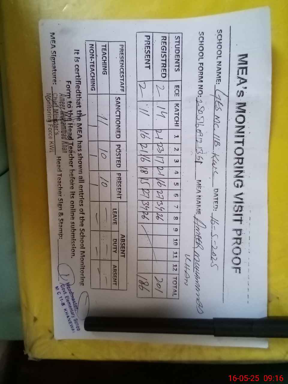| Attendance Register | Head Teacher | MEA with School | Visit Proof |