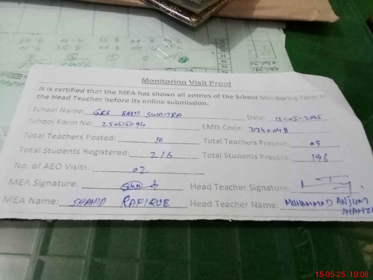 | Certified that this School was Inspected by the Undersigned MEA/DMO Today and the Information Stated Above is as Per Record. | |||||