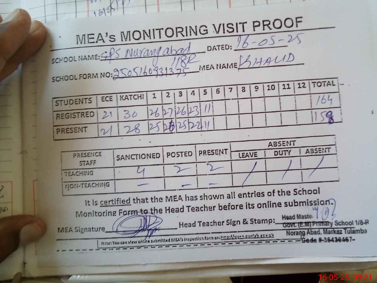 | Attendance Register | Head Teacher | MEA with School | Visit Proof |