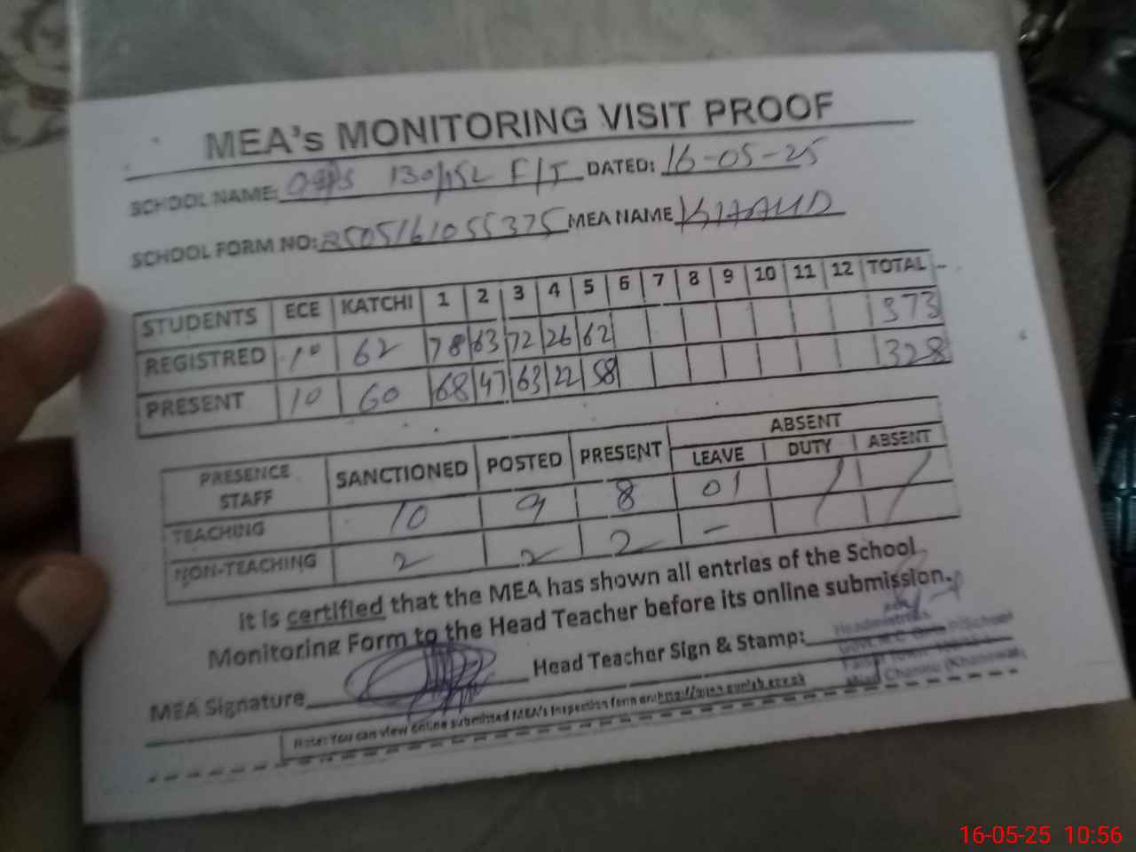 | Attendance Register | Head Teacher | MEA with School | Visit Proof |
