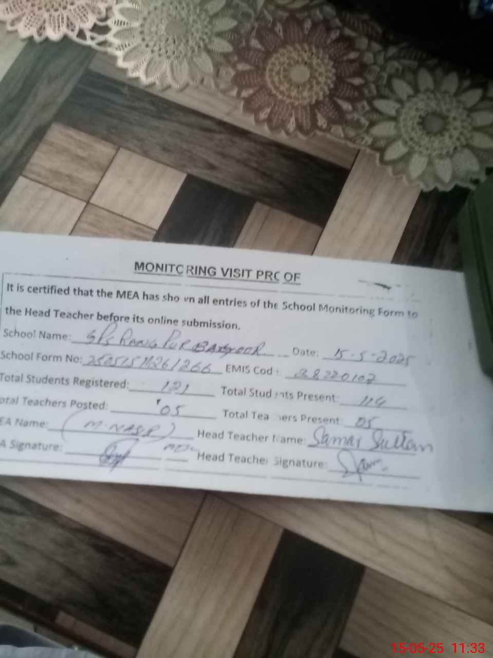 | Attendance Register | Head Teacher | MEA with School | Visit Proof |