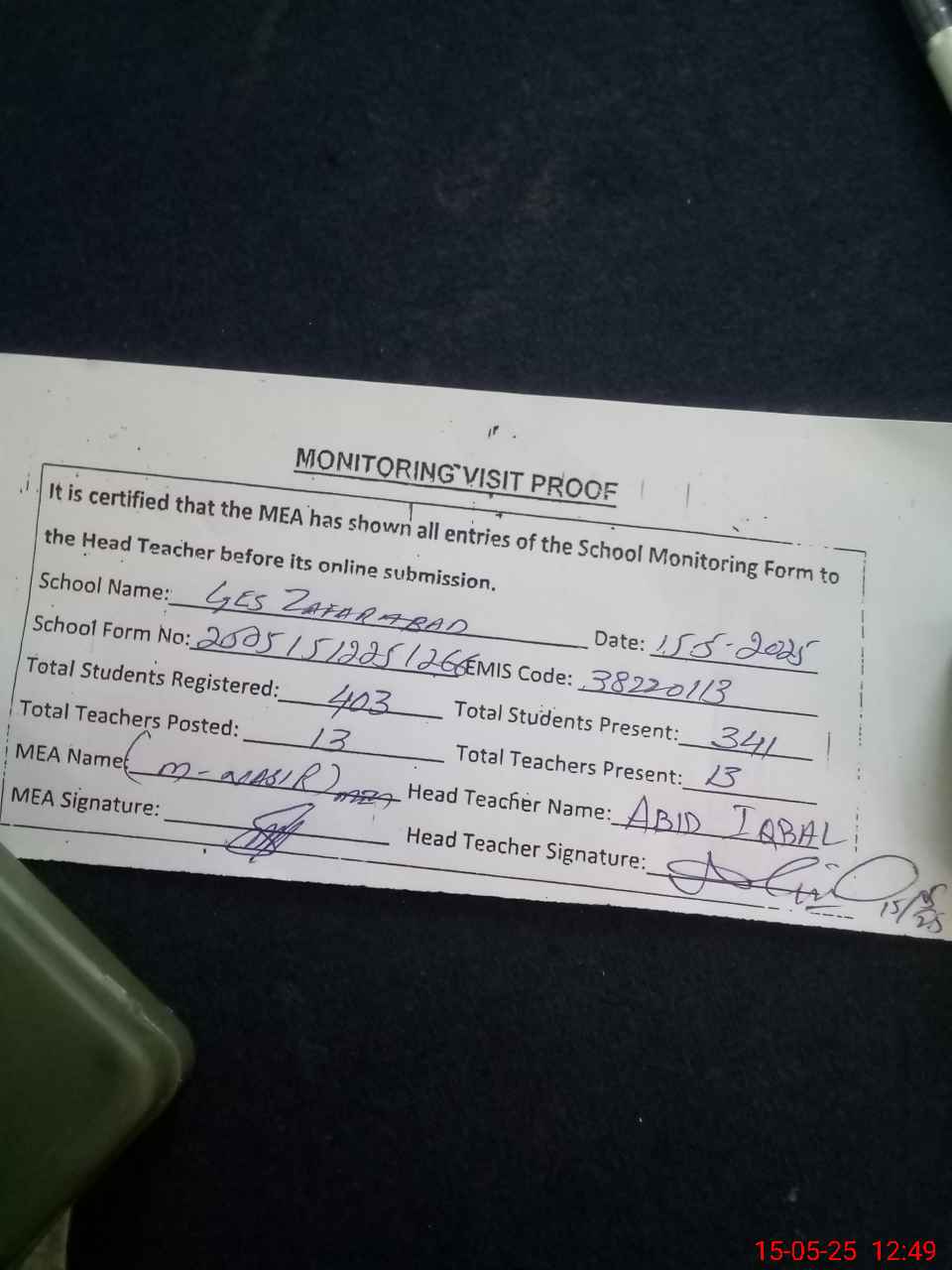 | Attendance Register | Head Teacher | MEA with School | Visit Proof |