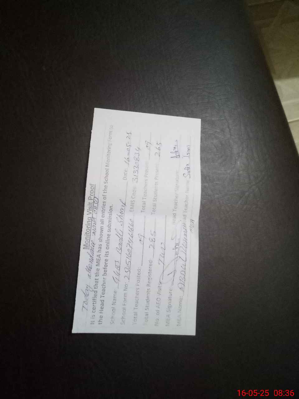 | Attendance Register | Head Teacher | MEA with School | Visit Proof |