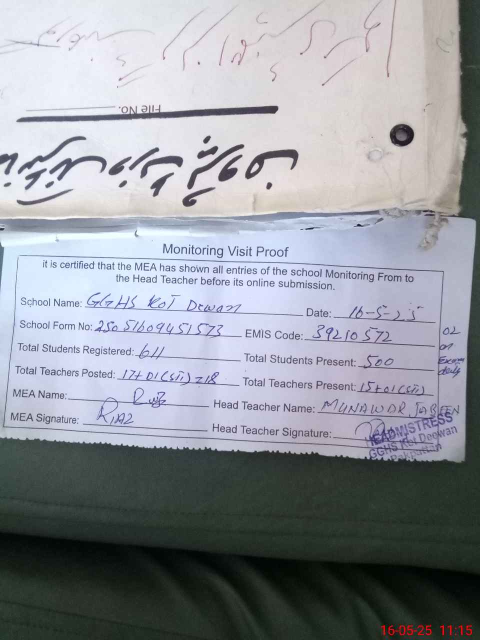 | Certified that this School was Inspected by the Undersigned MEA/DMO Today and the Information Stated Above is as Per Record. | |||||
