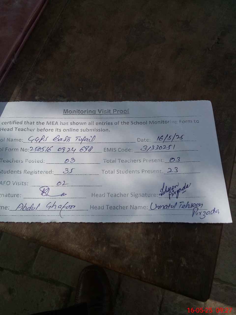 | Attendance Register | Head Teacher | MEA with School | Visit Proof |
