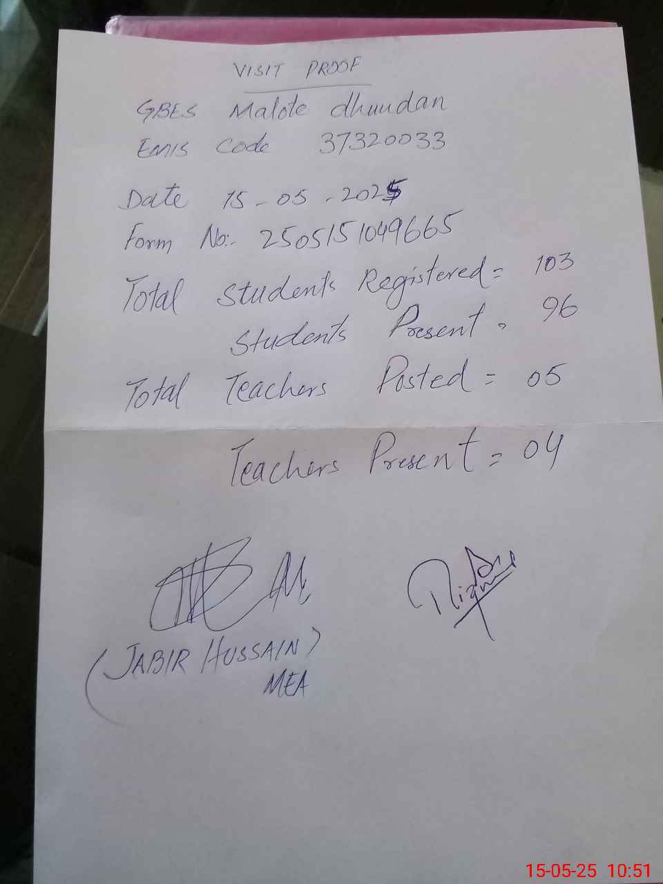 | Attendance Register | Head Teacher | MEA with School | Visit Proof |