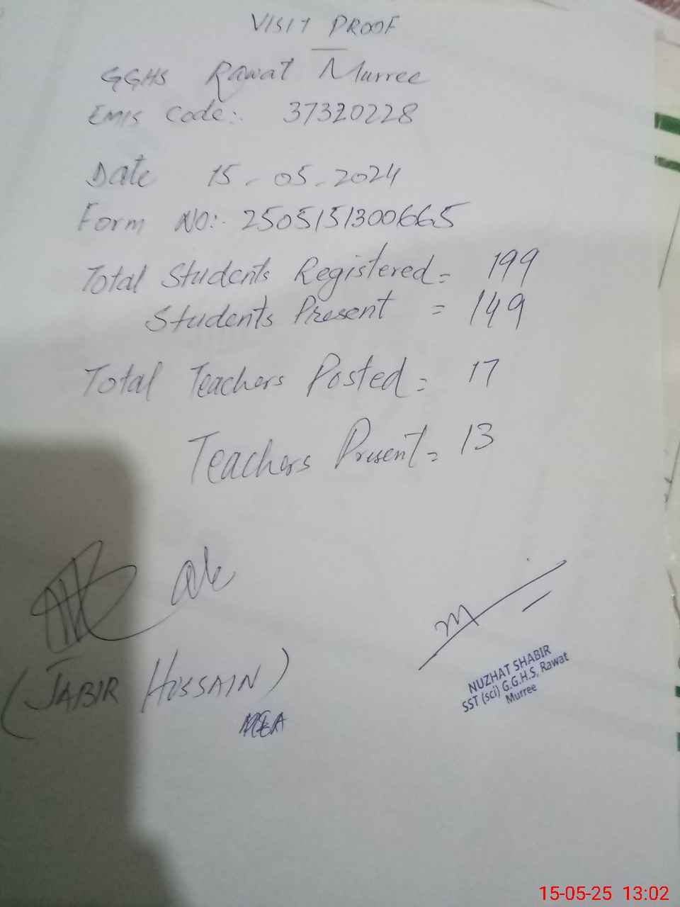 | Total no. of Classrooms: 16 No. of Classrooms Used for Teaching: 8 No. of Classrooms Storing Old Furniture, FTBs, etc: 0Comments if Any: One teacher name Sonia Jamil SST attached GGHS waris khan Rawalpindi wef 28th August 2023 to till date One teacher name Ayesha Saleh EST Urdu absent wef 17th April 2024 Two teachers on exam duty School tablet updating under process |