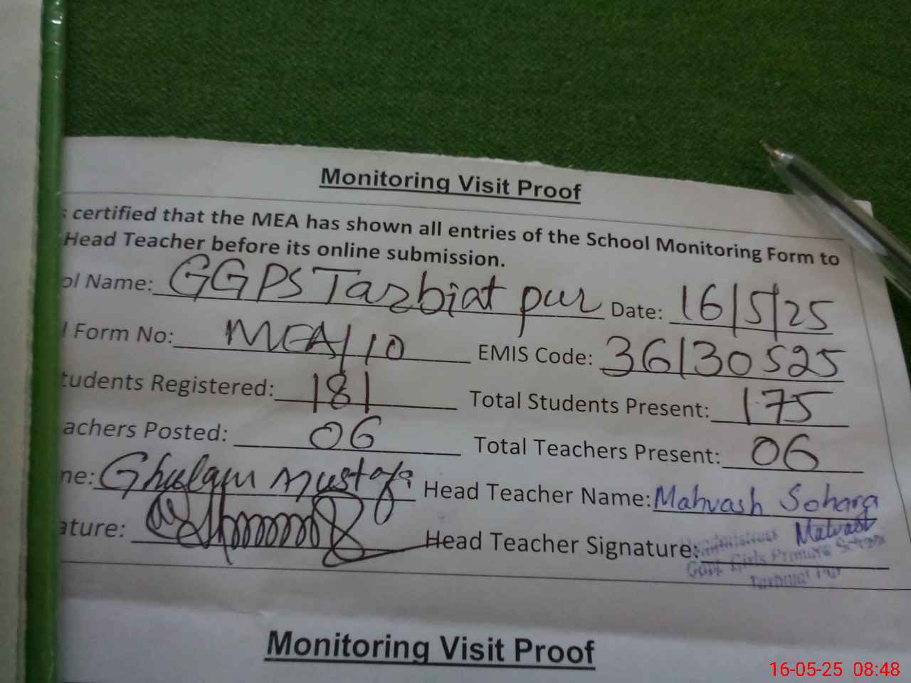 | Certified that this School was Inspected by the Undersigned MEA/DMO Today and the Information Stated Above is as Per Record. | |||||
