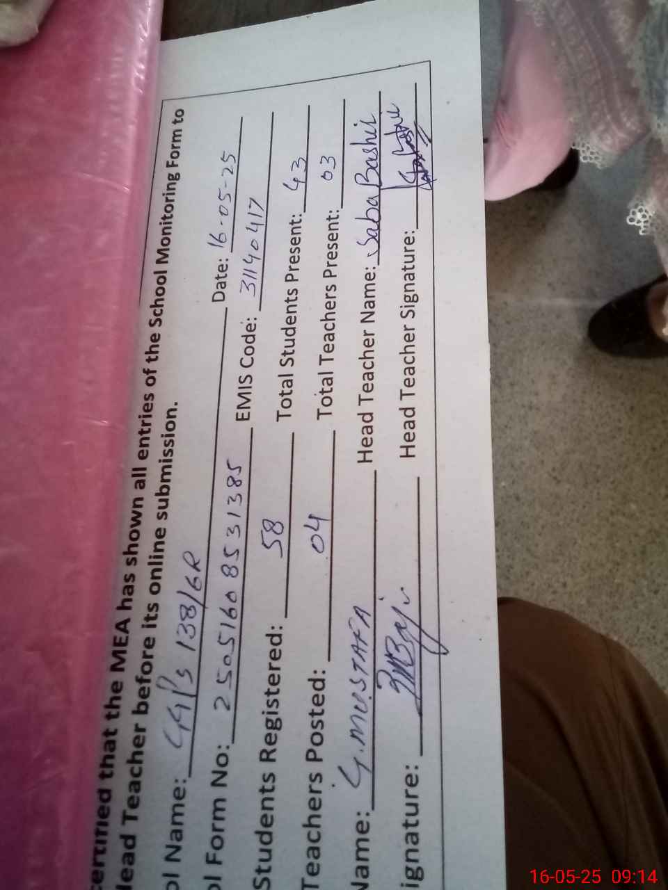 | EMIS Code: 31140417 | Name of School: GGPS CHAK NO 138/6-R | |||