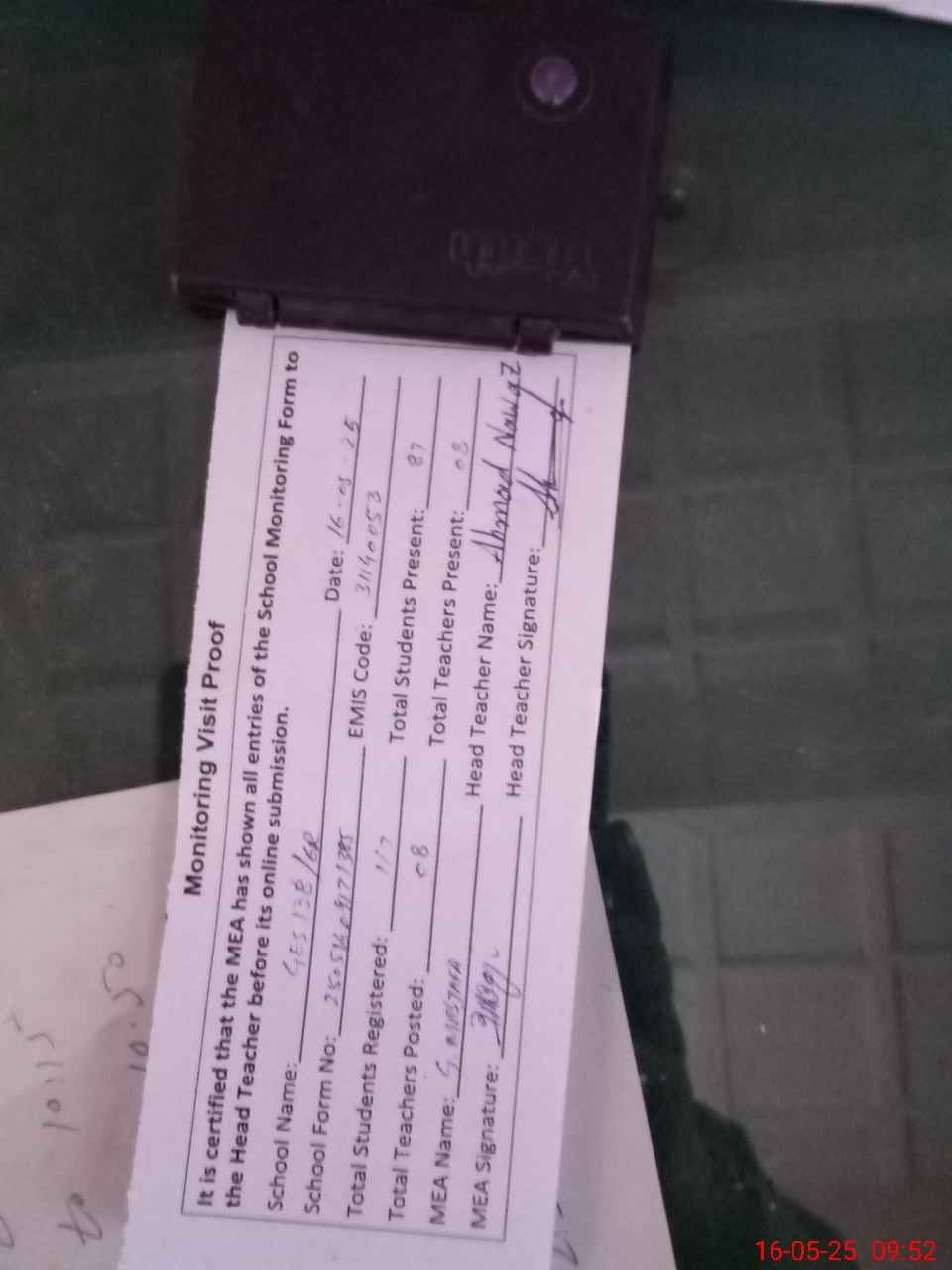 | Attendance Register | Head Teacher | MEA with School | Visit Proof |