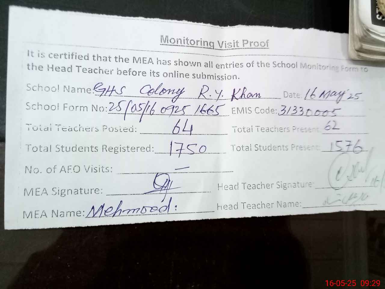 | EMIS Code: 31330005 | Name of School: GHS COLONY RAHIM YAR KHAN | |||