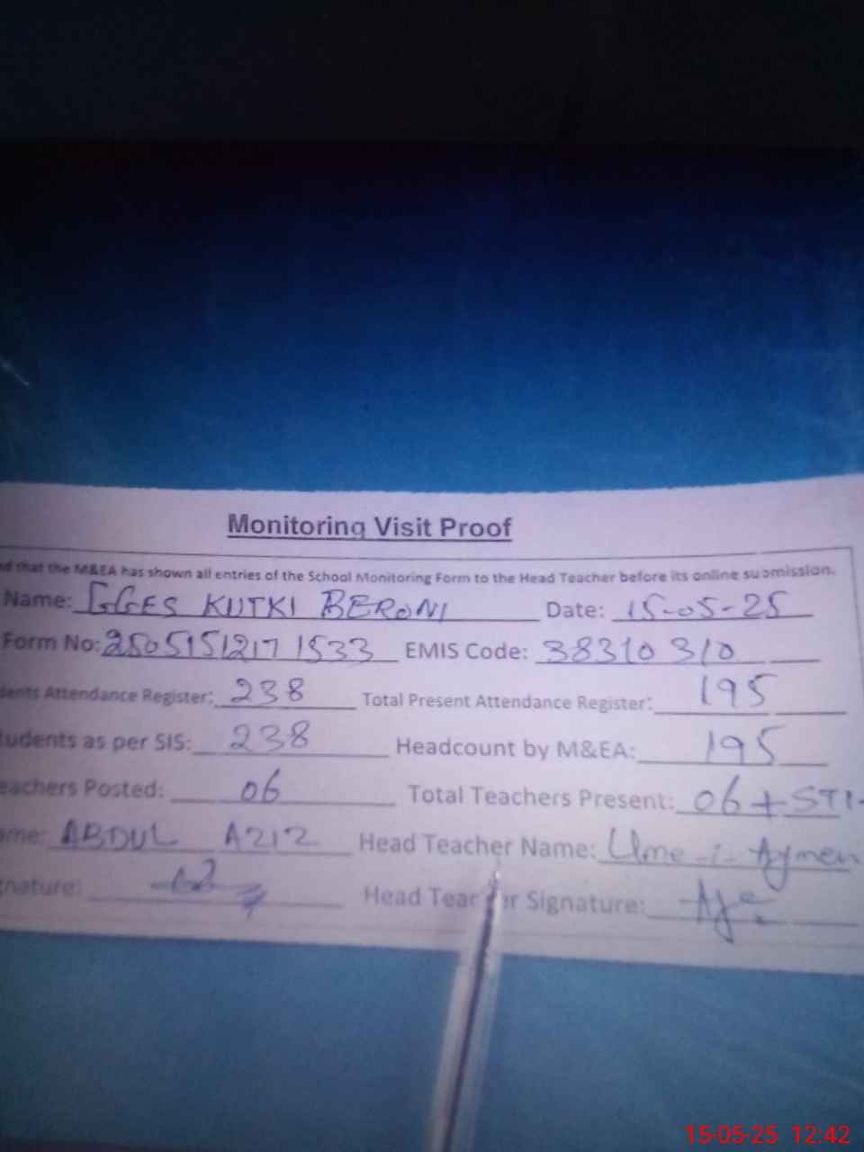 | Attendance Register | Head Teacher | MEA with School | Visit Proof |