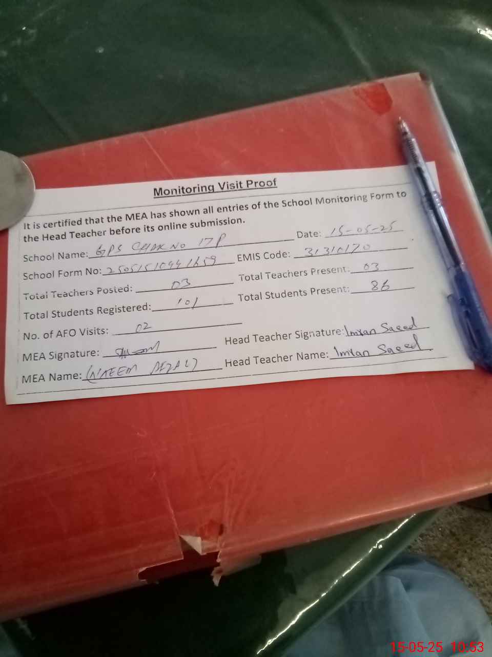 | Attendance Register | Head Teacher | MEA with School | Visit Proof |