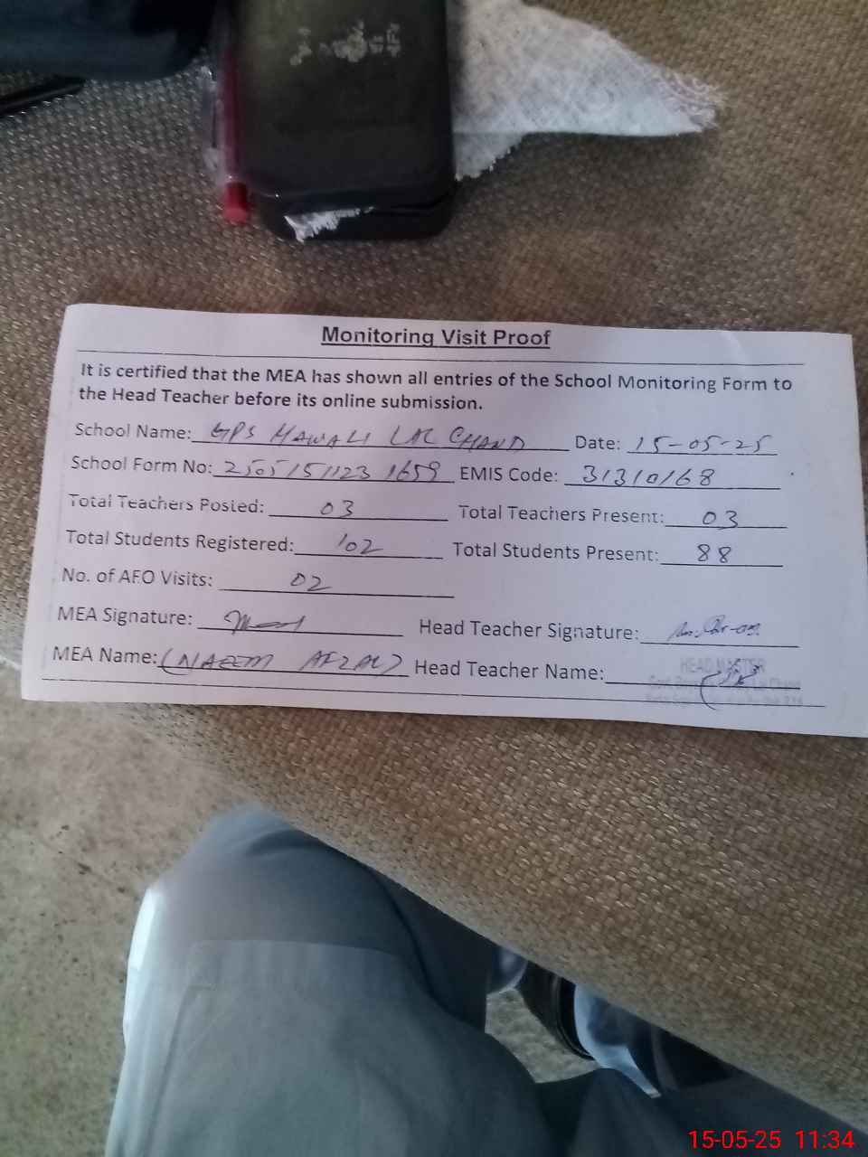 | Attendance Register | Head Teacher | MEA with School | Visit Proof |