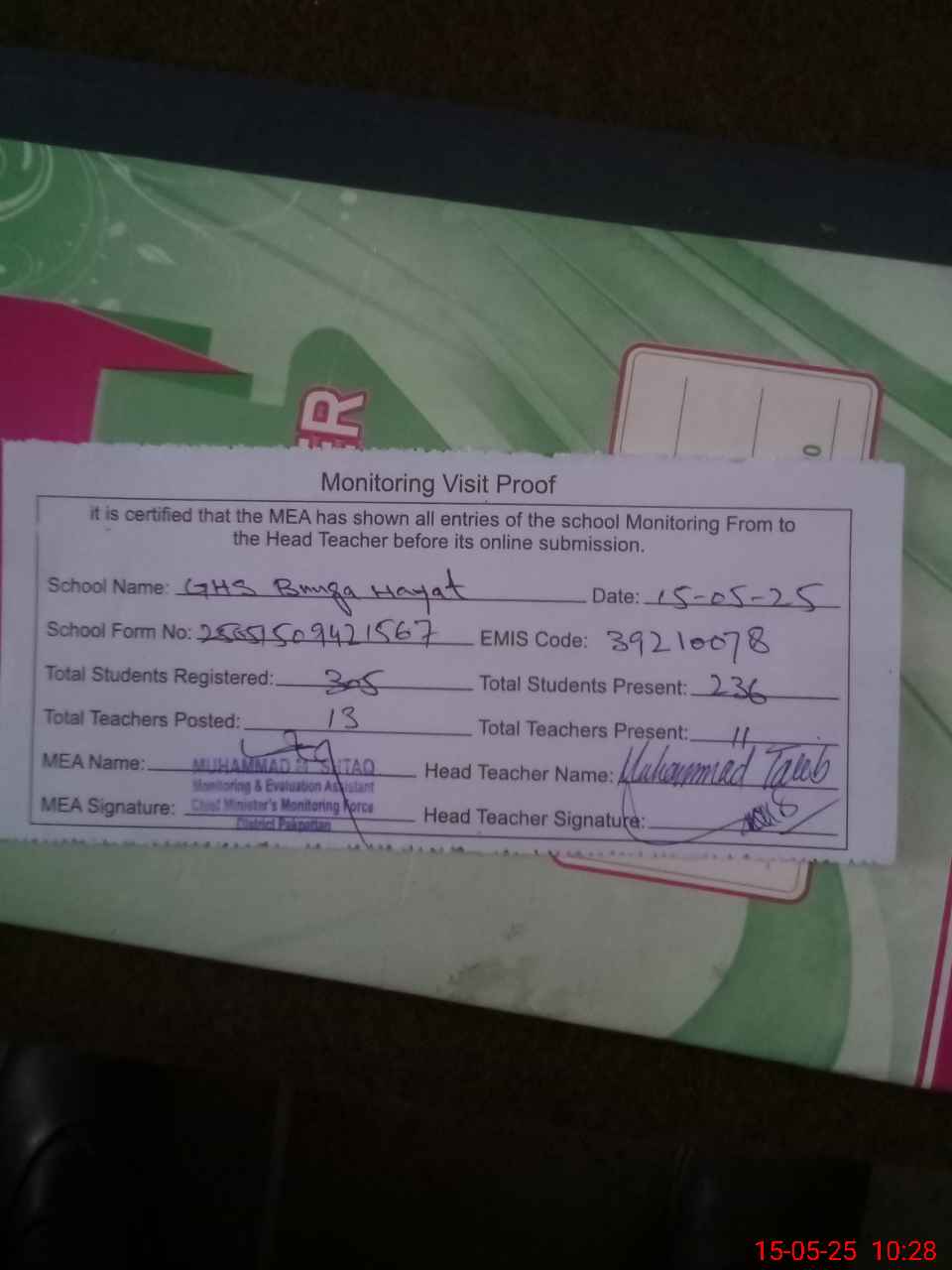 | EMIS Code: 39210078 | Name of School: GHS BUNGA HAYAT | |||