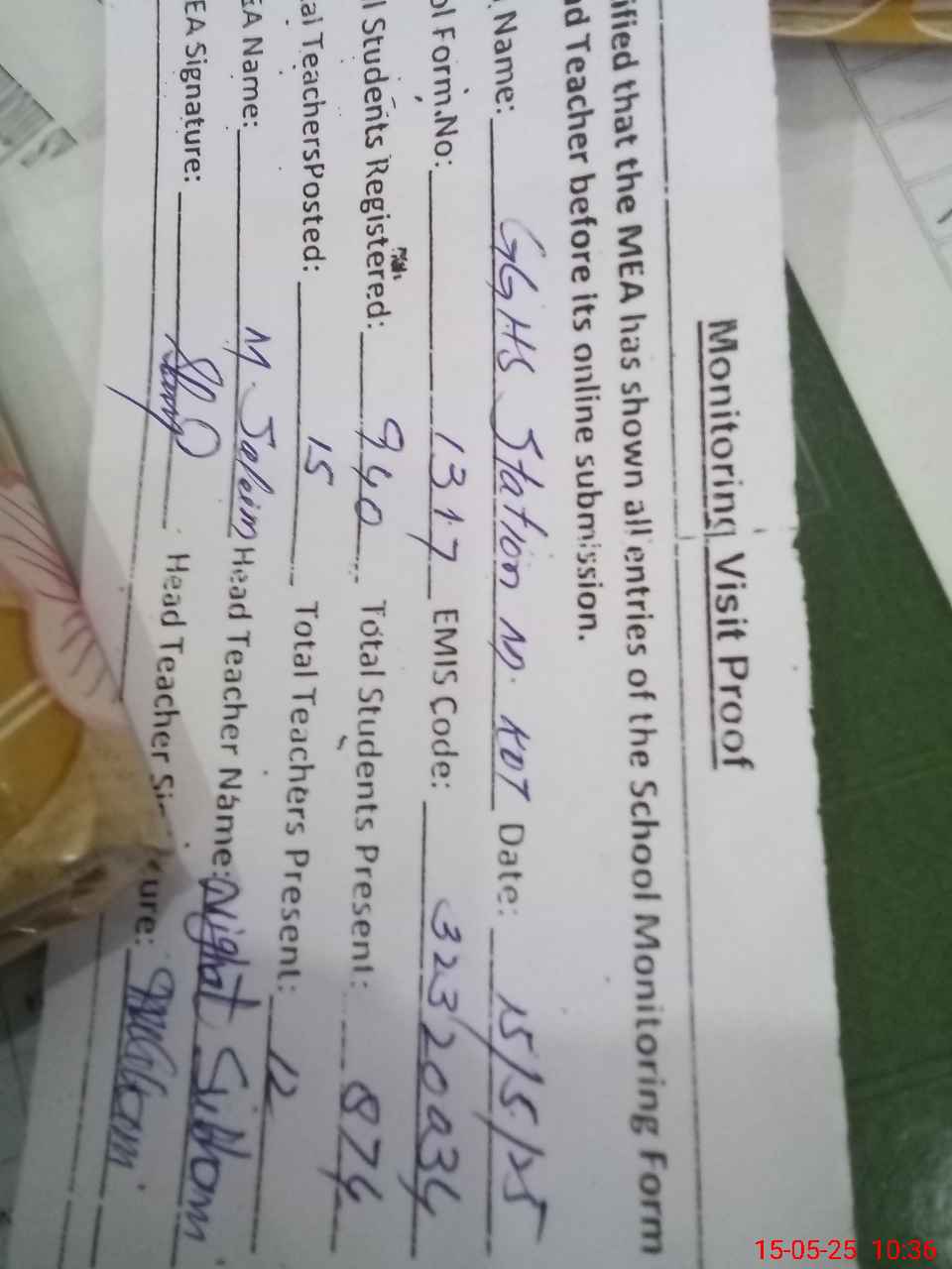 | Attendance Register | Head Teacher | MEA with School | Visit Proof |