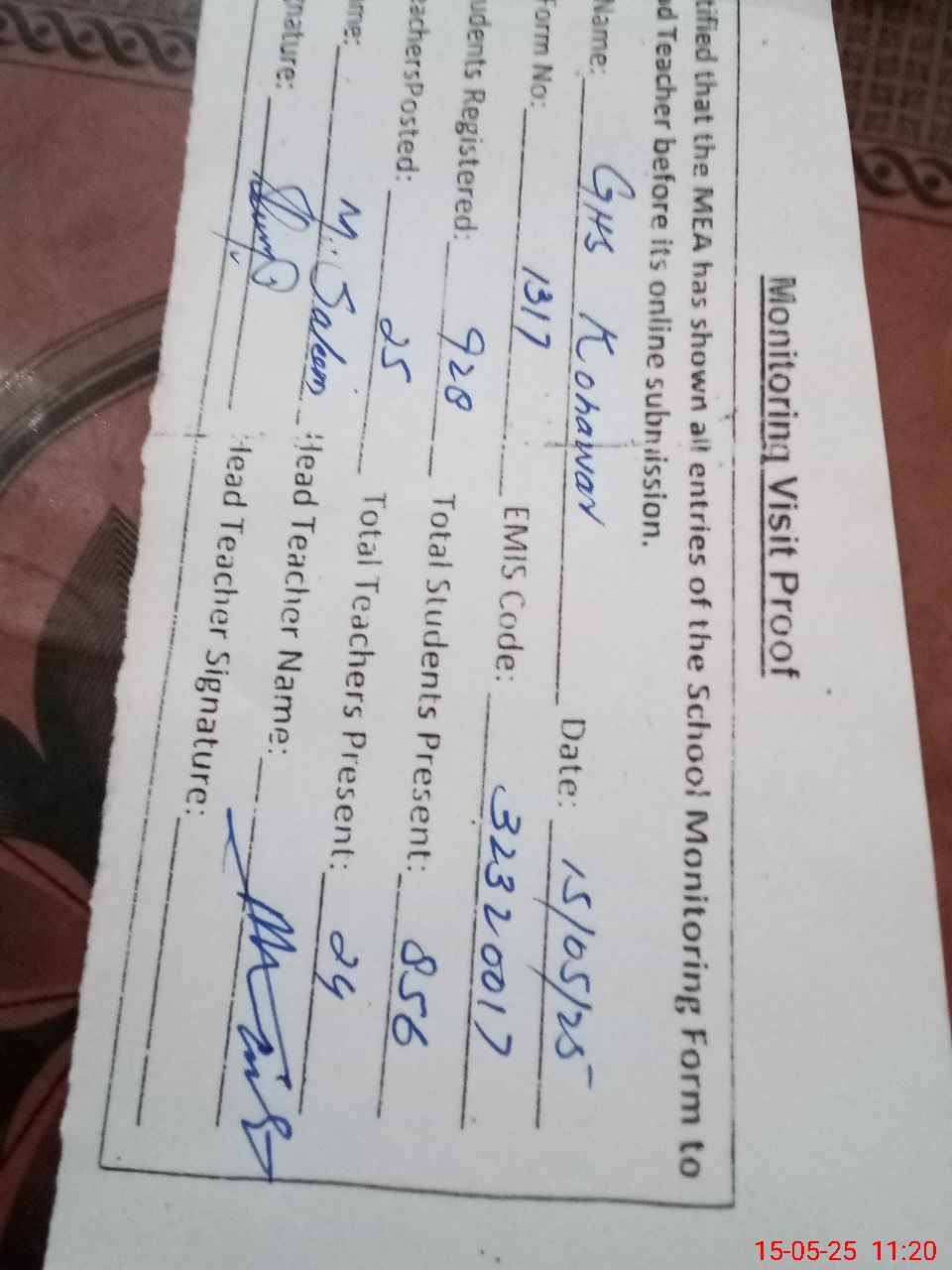 | Attendance Register | Head Teacher | MEA with School | Visit Proof |