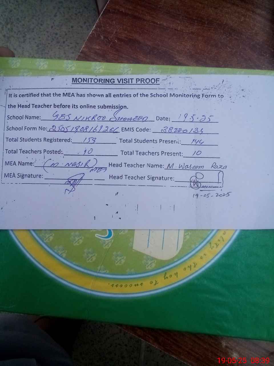 | Attendance Register | Head Teacher | MEA with School | Visit Proof |
