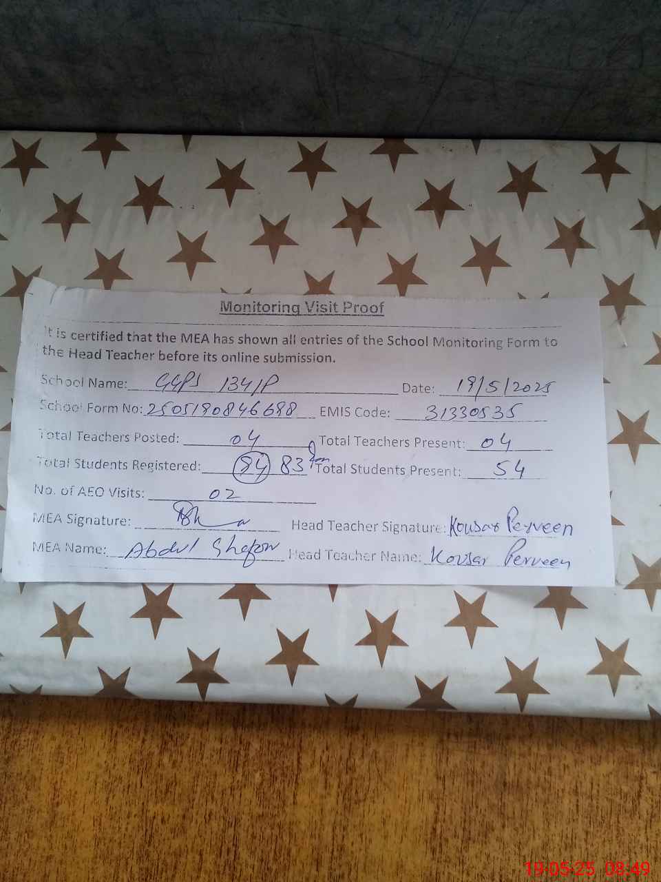 | Attendance Register | Head Teacher | MEA with School | Visit Proof |