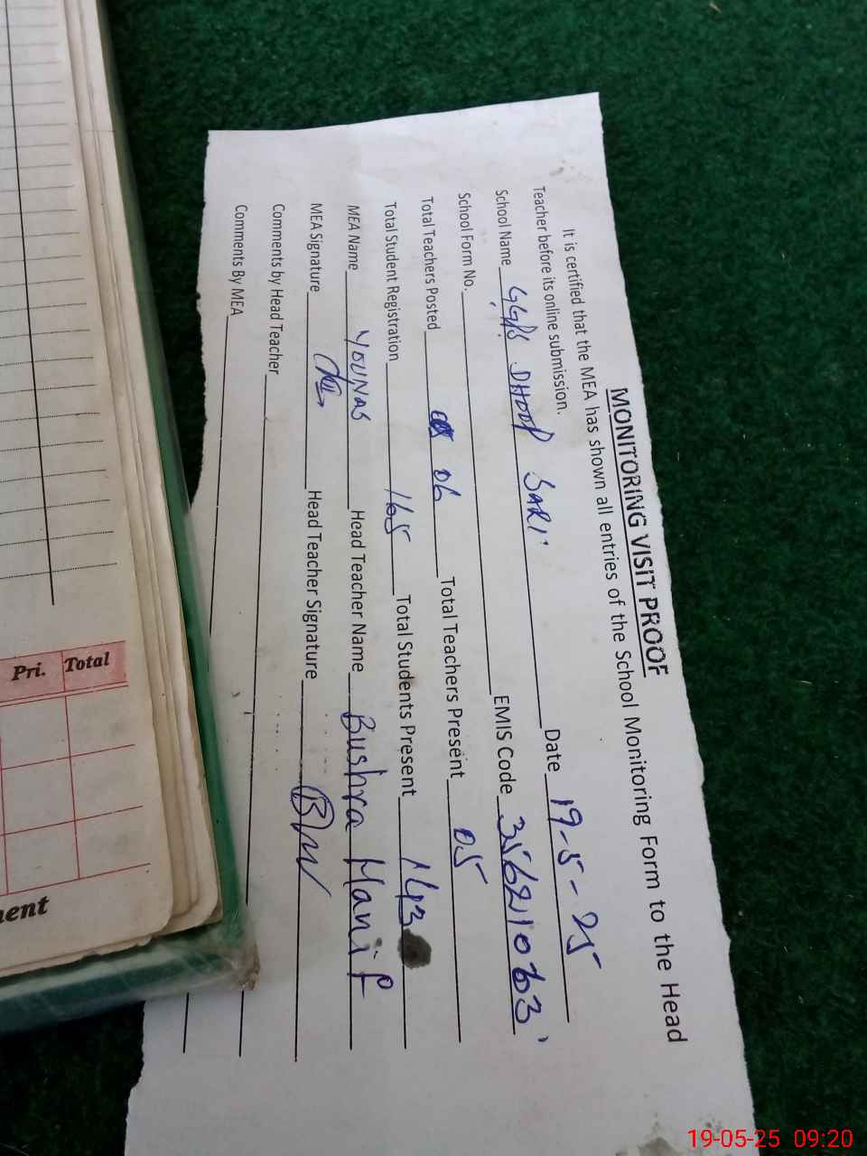 | Attendance Register | Head Teacher | MEA with School | Visit Proof |