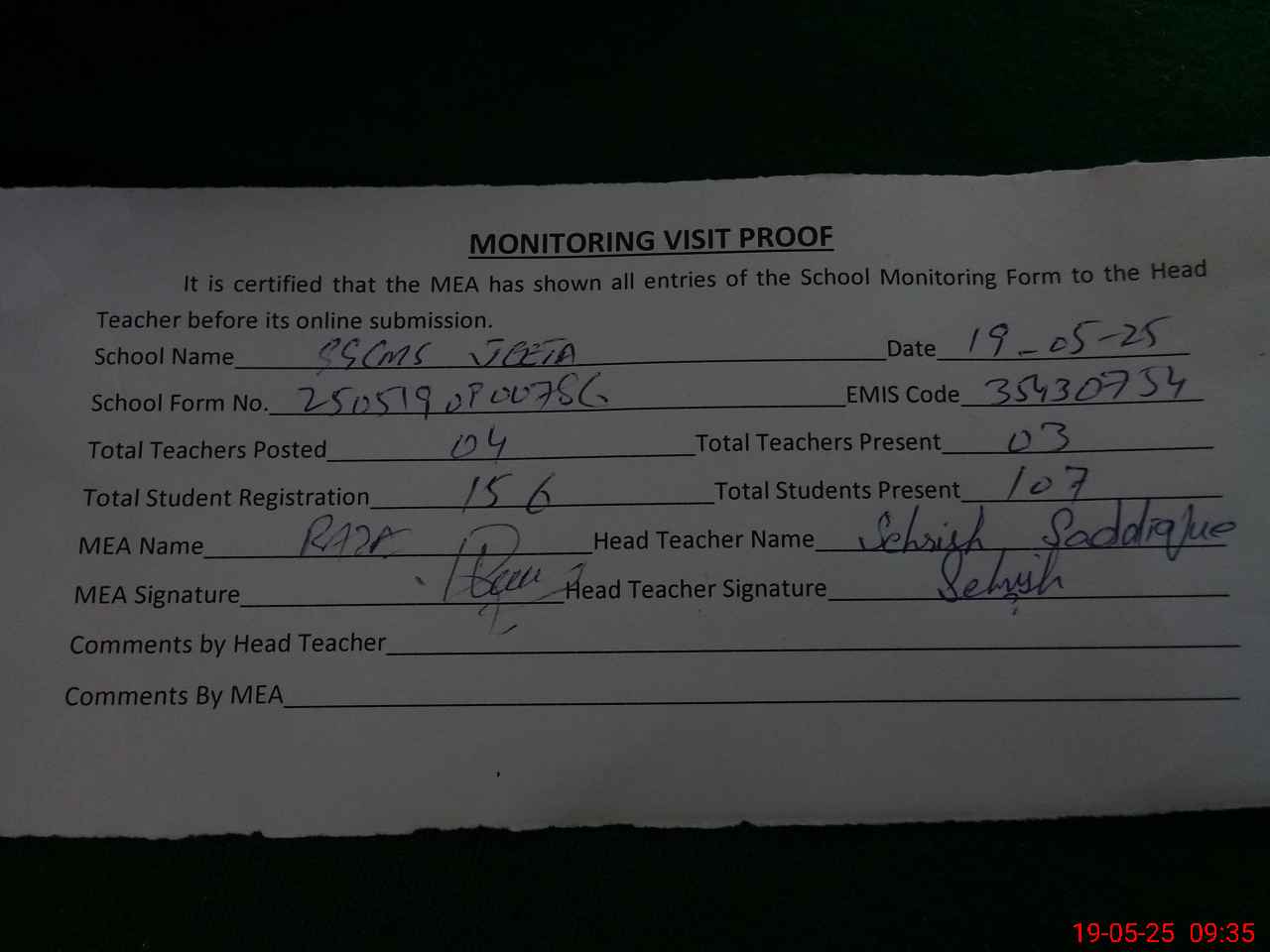 | Attendance Register | Head Teacher | MEA with School | Visit Proof |