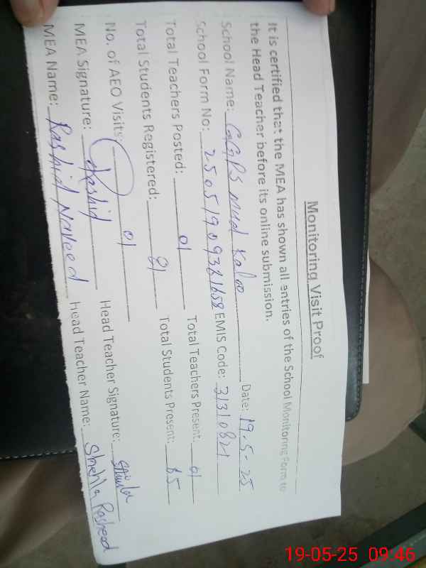 | Attendance Register | Head Teacher | MEA with School | Visit Proof |
